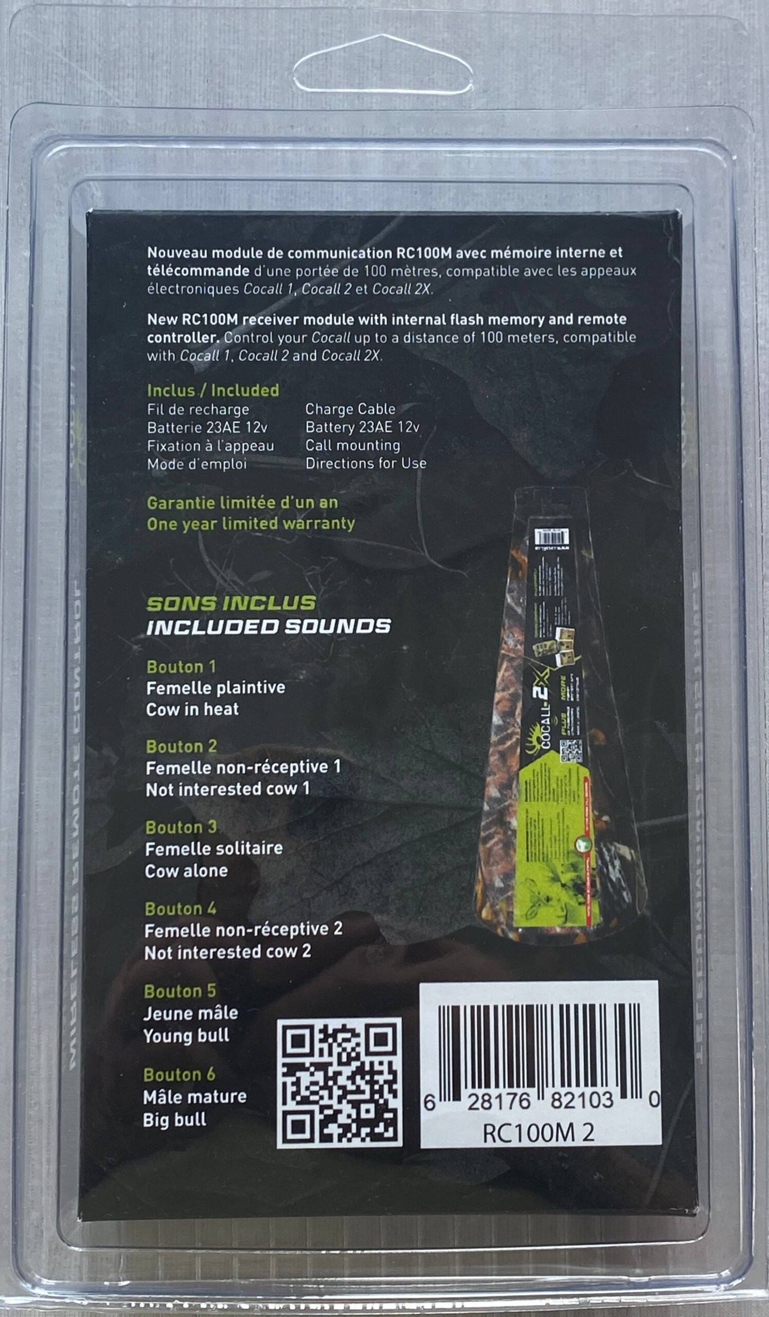 Télécommande sans fil Cocall offrant un contrôle à distance jusqu'à 100 mètres de tous les appeaux électroniques Cocall. Dotée d'une portée fiable et d'une interface intuitive, elle permet de basculer facilement entre six appels d'orignal préenregistrés : femelle plaintive, femelle non-réceptive, femelle solitaire, jeune mâle et mâle mature. L'ensemble complet comprend la batterie 23AE 12V, le câble de recharge, la fixation d'installation et le guide d'utilisation détaillé. Conçue pour les chasseurs exigeants qui recherchent précision et polyvalence en terrain.